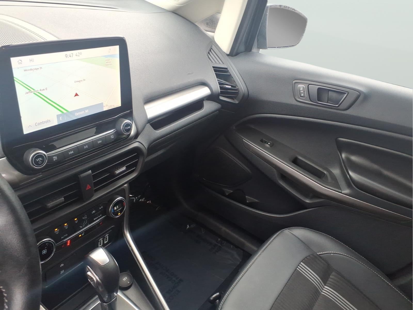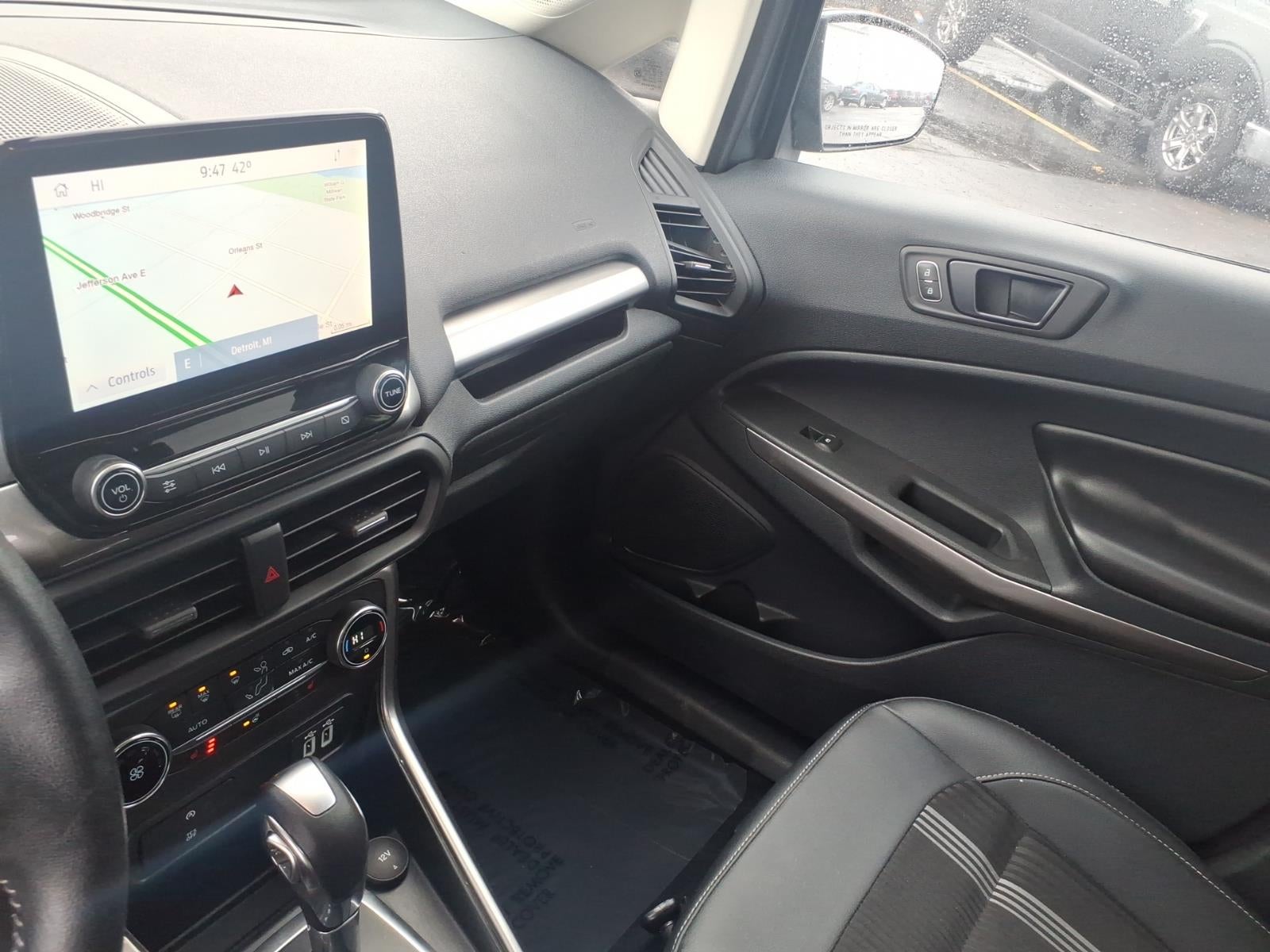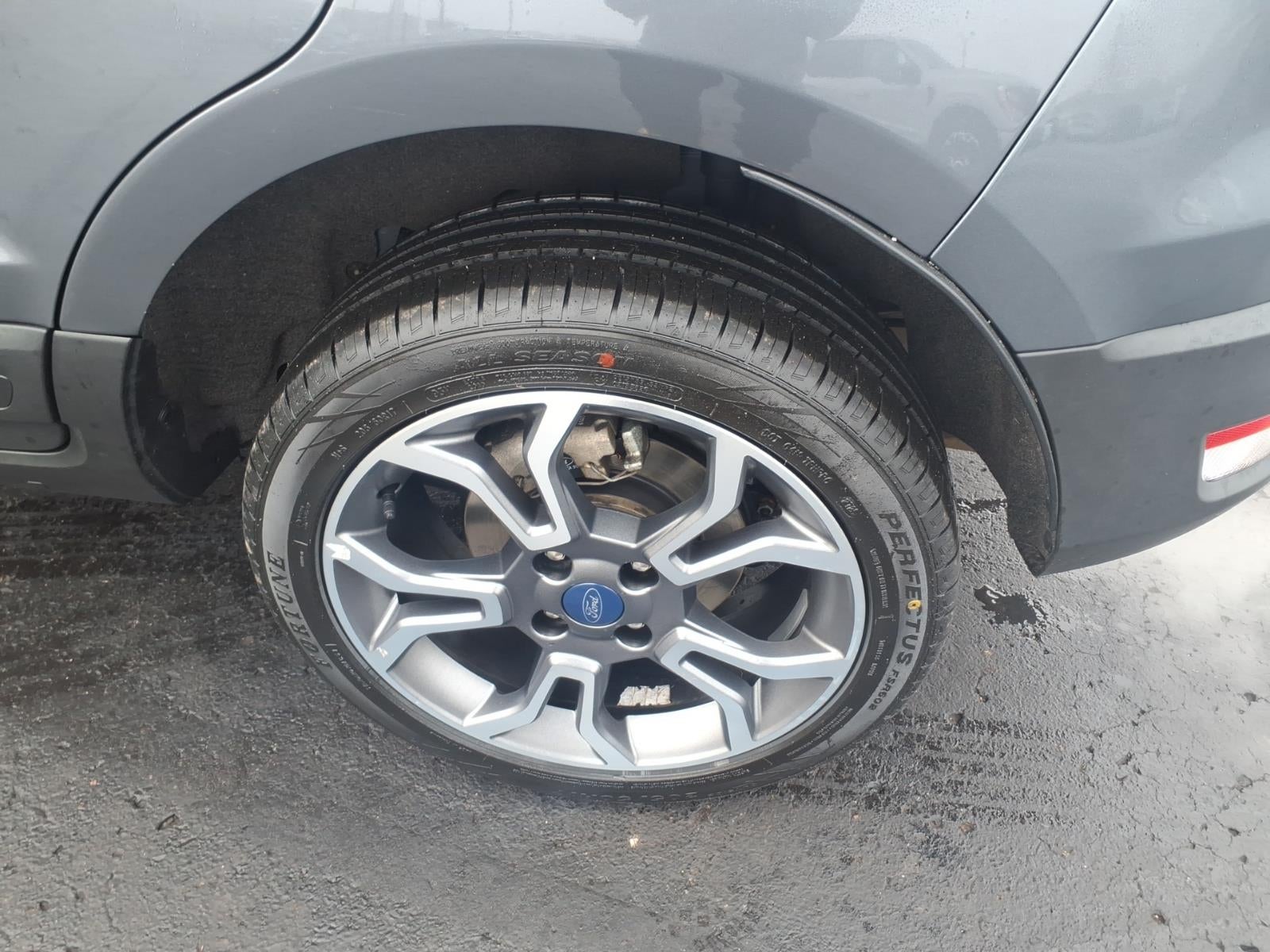EcoSport SES, 4D Sport Utility, 2.0L I4 Ti-VCT GDI, 6-Speed Automatic, 4WD, Smoke Metallic, Ebony Black Cloth, 4-Wheel Disc Brakes, ABS brakes, ActiveX Seating Material Heated Front Bucket Seats, Alloy wheels, AM/FM radio: SiriusXM, AppLink/Apple CarPlay and Android Auto, Auto-dimming Rear-View mirror, Automatic temperature control, Brake assist, Delay-off headlights, Driver door bin, Electronic Stability Control, Equipment Group 300A, Exterior Parking Camera Rear, Front fog lights, Fully automatic headlights, Heated steering wheel, Leather Shift Knob, Navigation System, Overhead console, Panic alarm, Power moonroof, Radio data system, Rain sensing wipers, Rear Parking Sensors, Rear side impact airbag, Rear window defroster, Rear window wiper, Remote keyless entry, Roof rack: rails only, SiriusXM Radio, SiriusXM Traffic & Travel Link, Speed control, Speed-sensing steering, Spoiler, Steering wheel mounted audio controls, SYNC 3 Communications & Entertainment System, Tachometer, Telescoping steering wheel, Tilt steering wheel, Traction control, Trip computer, Turn signal indicator mirrors, Variably intermittent wipers, Wheels: 17 Painted Machined Aluminum.